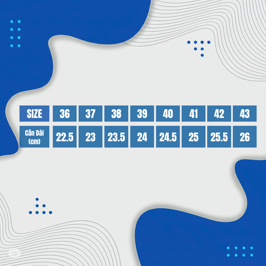 | Size giày | 36, 37, 38, 39, 40, 41, 42, 43 |